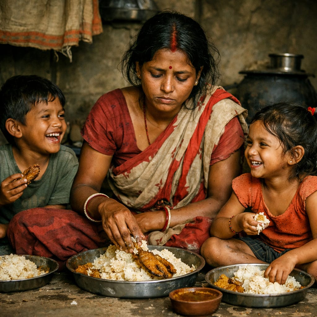 তাও ভালো, পাড়ার নগেন খুড়োর দয়ায় বাচ্চা দুটো ভাতের সাথে আজ একটু মাছ